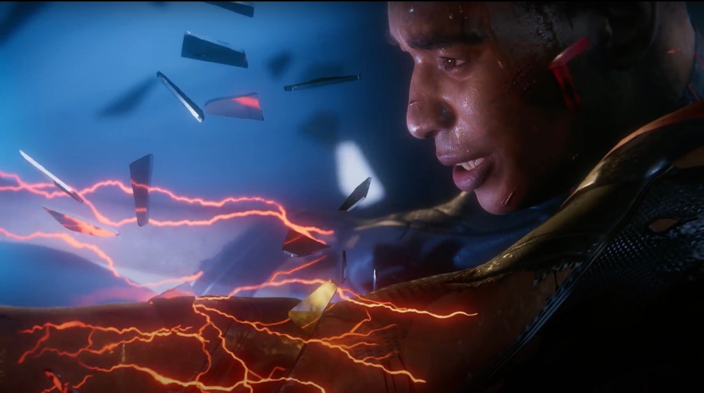 Firstly, Miles. The first thing we see in this trailer is Mile’s suit slowly flaking off as orange tendrils of electricity slither along his arms. The camera slowly pans over to Mile’s face as his masks flakes away, and he grits his teeth at whatever this new threat is. With a narration from Peter, Miles shouts and the screen fades to black.